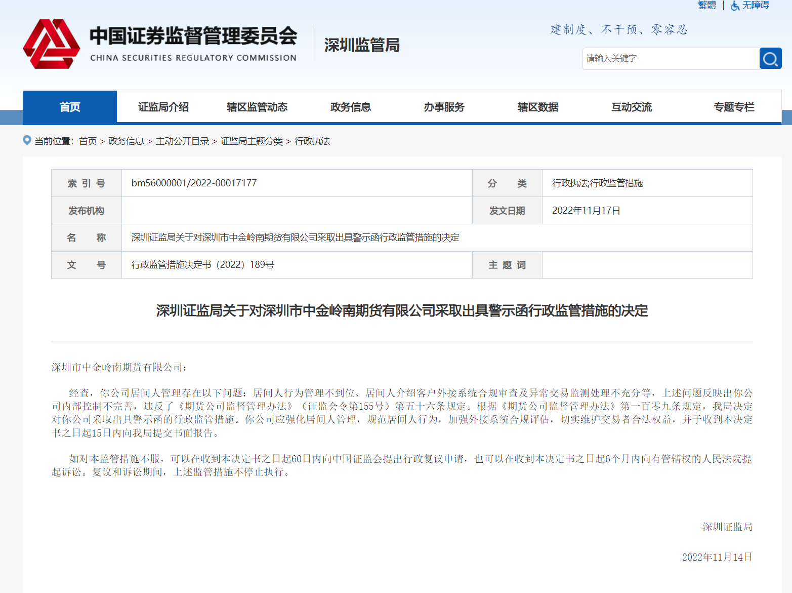 据深圳证监局官网11月14日公布的关于对中金岭南期货采取出具警示函行政监管措施的决定,经查,中金岭南期货居间人管理存在以下问题:居间人行为管理不到位、居间人介绍客户外接系统合规审查及异常交易监测处理不充分等,上述问题反映出公司内部控制不完善,违反了《期货公司监督管理办法》(证监会令第155号)第五十六条规定。
