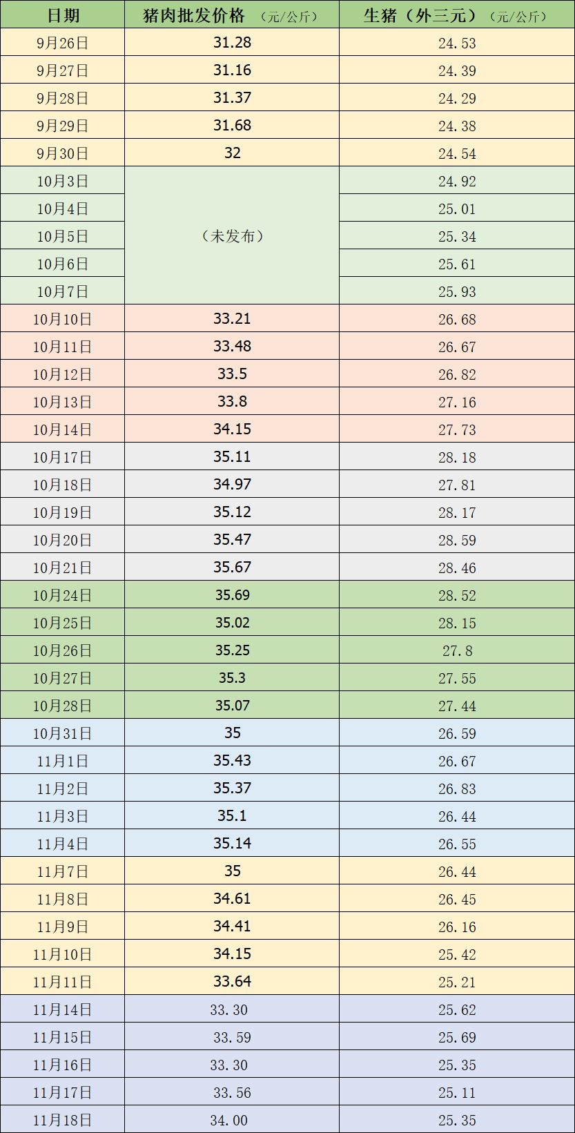 据农业农村部监测,11月18日,全国农产品批发市场猪肉平均价格为34.00元/公斤,比前一天上升1.3%;与上周五(11月11日)的33.64元/公斤相比,上涨1%。本周的平均价格为33.55元/公斤,与上周的34.36元/公斤相比,下降2.4%。