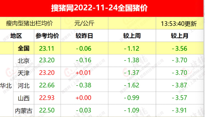 中国生猪预警网数据显示,11月24日全国瘦肉型猪出栏均价为23.11元/公斤,较昨日下跌0.06元,较上个月下跌3.56元。而今年出栏均价的最高点曾出现在10月中下旬,在养殖端压栏和二次育肥的影响下,猪肉出栏均价曾一度站上过28元的高点。第一财经记者从业内人士处了解到,年内出栏均价高点或已出现,之后价格上涨的概率不大。