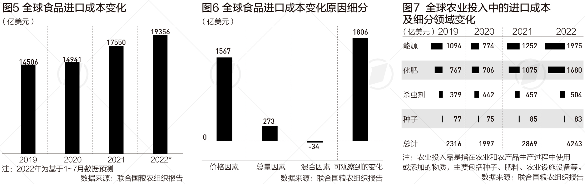 在全球于农业投入品领域的支出中,也同样如此。农业投入品是指在农业和农产品生产过程中使用或添加的物质,主要包括种子、肥料、农业设施设备等。今年全球农业投入品进口费用达4243亿美元,同比增长近50%,甚至是2020年水平(2000亿美元不到)的两倍以上。