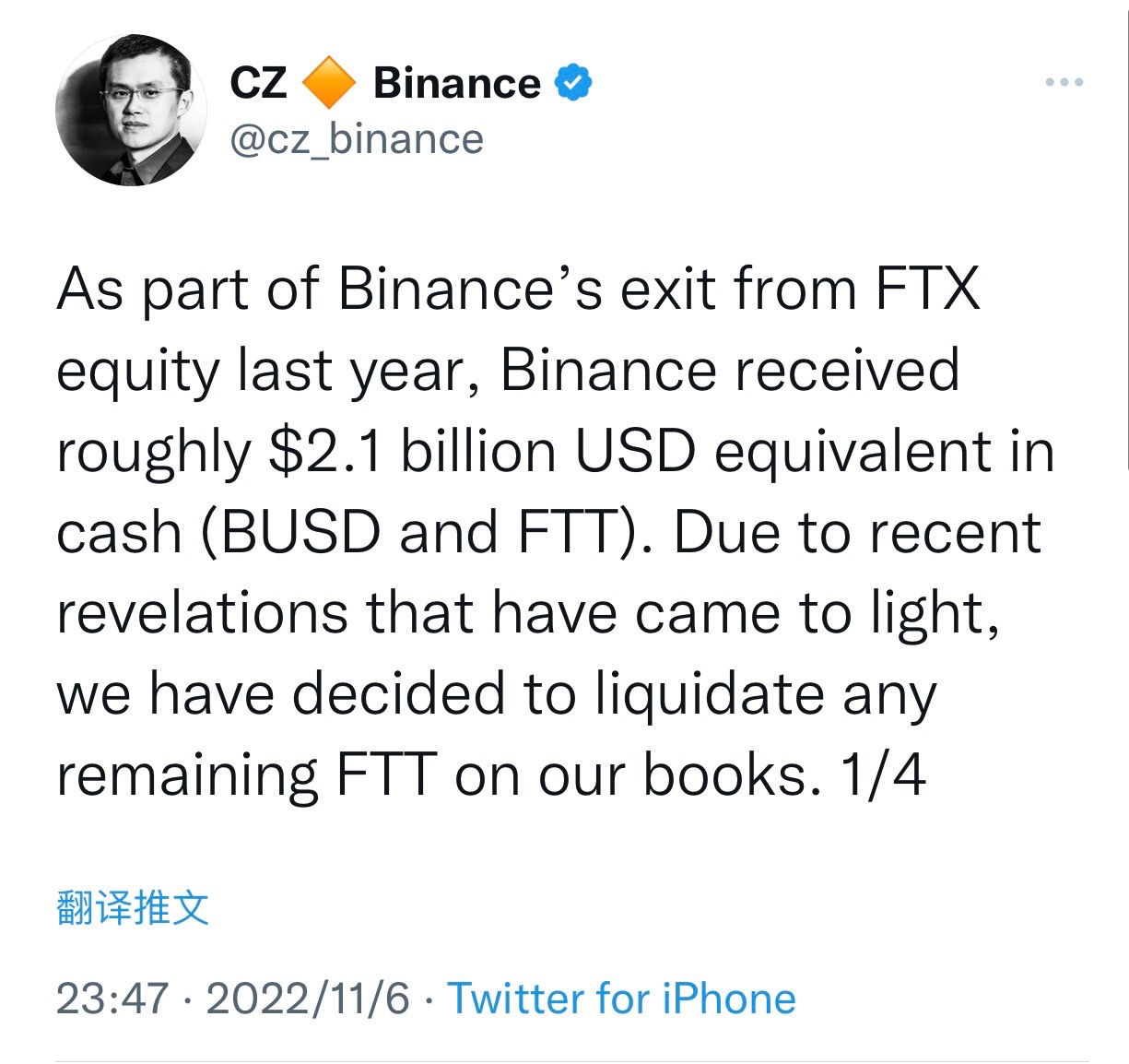 尽管币安牵头设立行业复苏计划,赵长鹏在FTX破产事件中仍具有较大争议性。有外媒提及,市场对于FTX的恐慌情绪始于赵长鹏的一条推文。当地时间11月6日,他在推文中表示,“由于最近揭露出来的真相,币安决定将所有自持的FTT(当时约为5.3亿美元)进行清算。”自此,事件正式“白热化”,FTX陷入流动性危机。