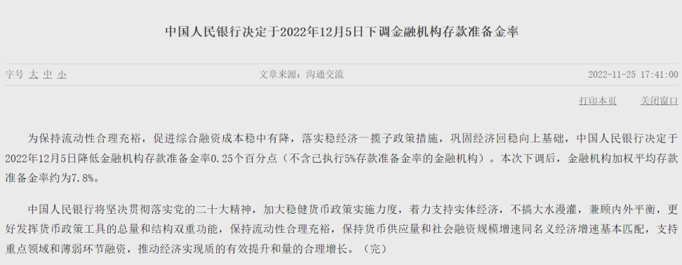 11月25日,人民银行发布消息称,为保持流动性合理充裕,促进综合融资成本稳中有降,落实稳经济一揽子政策措施,巩固经济回稳向上基础,决定于2022年12月5日降低金融机构存款准备金率0.25个百分点(不含已执行5%存款准备金率的金融机构)。