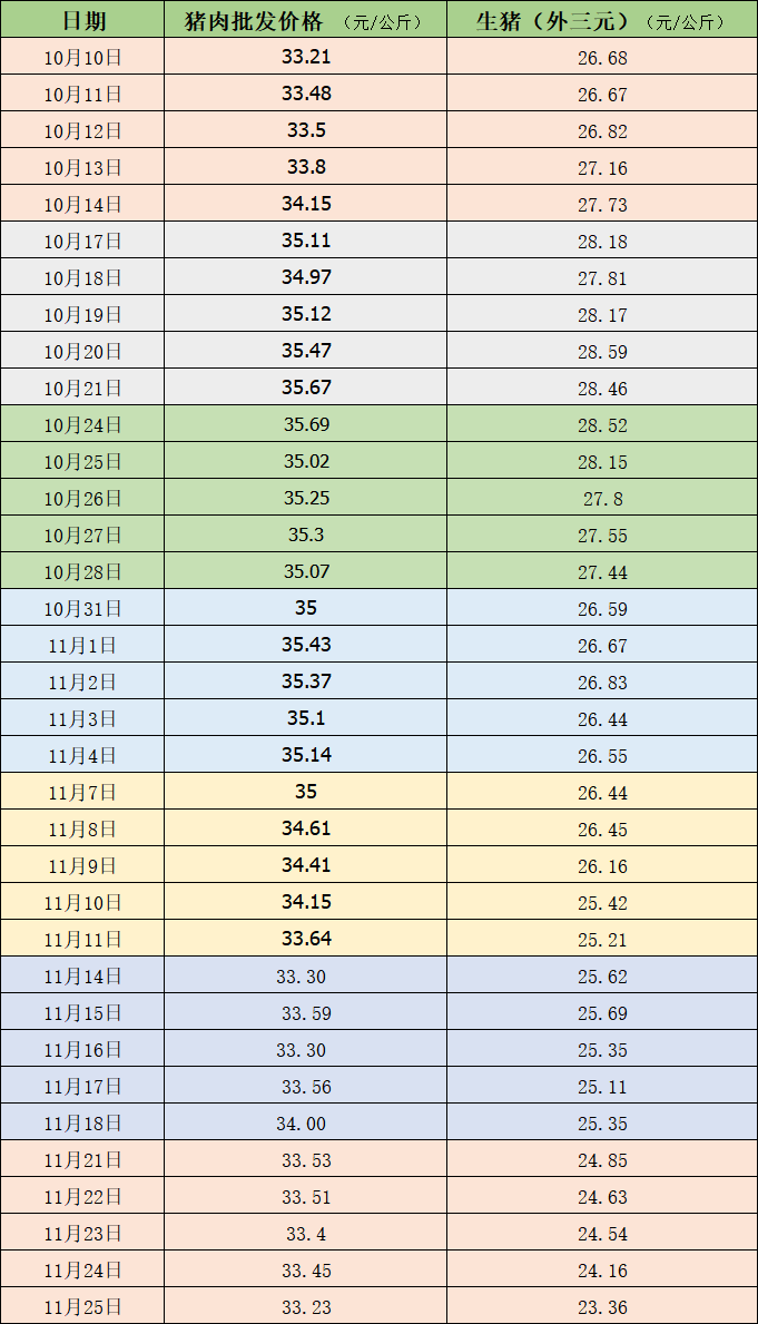 据农业农村部监测,11月25日,全国农产品批发市场猪肉平均价格为33.23元/公斤,比前一天下降0.7%。与上周五(11月18日)的34元/公斤相比,下降2.3%。本周的平均价格为33.42元/公斤,与上周的33.55元/公斤的均价相比,下降0.4%。