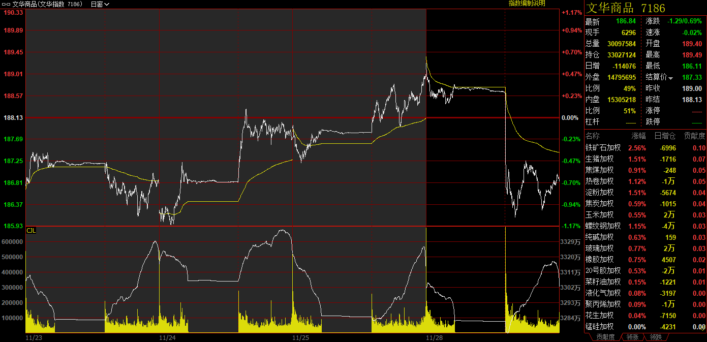 国内商品期货市场11月28日多数下跌。截至下午收盘时,追踪国内商品市场的综合指数收报186.84点,较前一交易日下跌1.29点,跌幅0.69%。其中,SC原油主力合约跌超4%;燃料油、LU、EG主力合约跌超3%;沥青、沪镍、EB、PVC主力合约跌超2%。上涨品种方面,铁矿主力合约涨超2%;淀粉、生猪、热卷、螺纹、橡胶主力合约涨超1%。