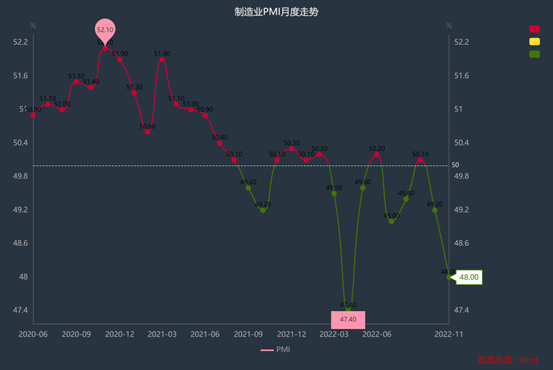 11月30日,国家统计局发布的数据显示,11月制造业采购经理指数(PMI)为48%,比上月下降1.2个百分点;非制造业商务活动指数为46.7%,比上月下降2个百分点;综合PMI产出指数为47.1%,比上月下降1.9个百分点。3项PMI指数均低于临界点,为年内次低水平。