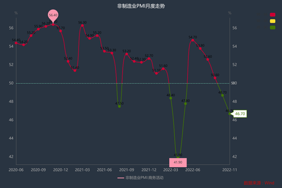 王青表示,11月全国疫情升温,消费场景受限,制造业市场需求受到较大冲击,叠加当前出口转弱,11月制造业PMI新订单和新出口订单指数同步走低,而因需求不振拖累生产,当月制造业PMI中的生产指数也有一定幅度下行。同时,11月楼市继续处于低迷状态,房地产投资、涉房消费下滑,也会对制造业乃至服务业PMI指数形成一定不利影响。