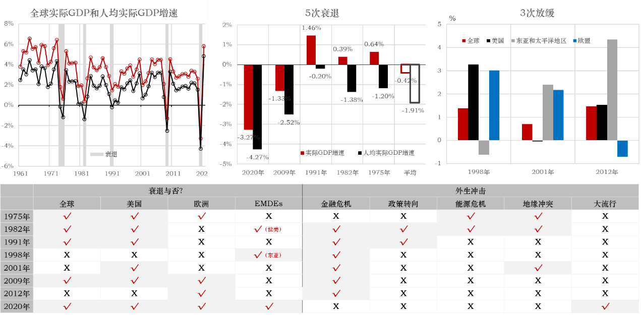 自上世纪60年代以来,全球共出现过5次衰退和3次放缓(图1)。5次衰退分别为:1974-1975年、1982年、1991年、2009年和2020年。2020年衰退最严重,人均实际GDP增速为-4.27%,其次是2009年(-2.52%),1982年和1975年分别为-1.38%和-1.20%,1991年仅为-0.2%。5次衰退的平均增速为-1.91%,相比扩张期平均增速(2.2%)低4.1个百分点。