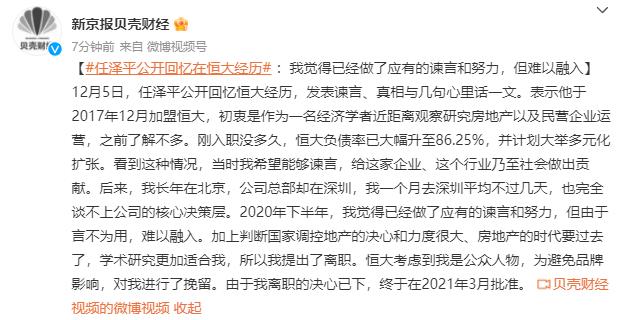 12月5日,任泽平公开回忆恒大经历,发表谏言、真相与几句心里话一文。表示他于2017年12月加盟恒大,初衷是作为一名经济学者近距离观察研究房地产以及民营企业运营,之前了解不多。刚入职没多久,恒大负债率已大幅升至86.25%,并计划大举多元化扩张。看到这种情况,当时我希望能够谏言,给这家企业、这个行业乃至社会做出贡献。后来,我长年在北京,公司总部却在深圳,我一个月去深圳平均不过几天,也完全谈不上公司的核心决策层。2020年下半年,我觉得已经做了应有的谏言和努力,但由于言不为用,难以融入。加上判断国家调控地产的决心和力度很大、房地产的时代要过去了,学术研究更加适合我,所以我提出了离职。恒大考虑到我是公众人物,为避免品牌影响,对我进行了挽留。由于我离职的决心已下,终于在2021年3月批准。