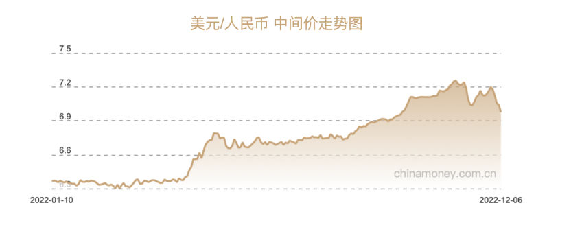 继12月5日在岸人民币、离岸人民币对美元汇率双双收复“7”元关口后,12月6日,人民币对美元汇率中间价报6.9746元,单日调升638个基点,正式回到“6”字头时代。