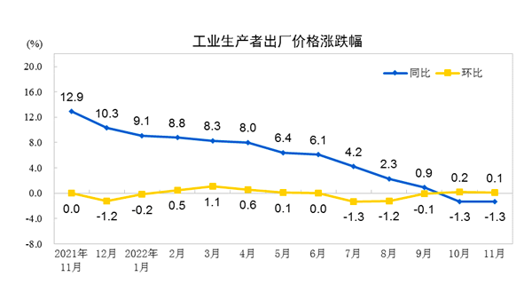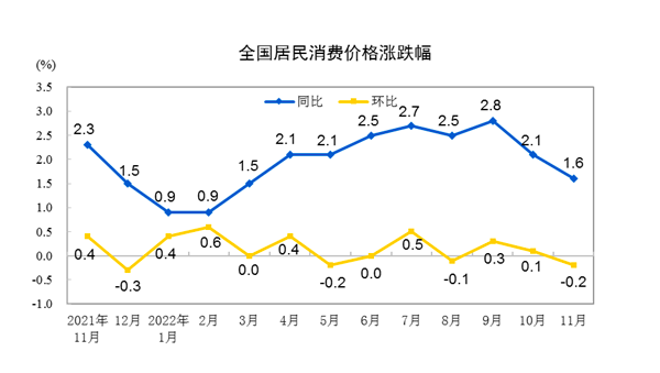 国家统计局12月9日发布的数据显示,11月消费者价格指数(CPI)同比上涨1.6%,涨幅较10月回落0.5个百分点;工业品出厂价格(PPI)同比下降1.3%,与上月持平,连续两个月负增长。