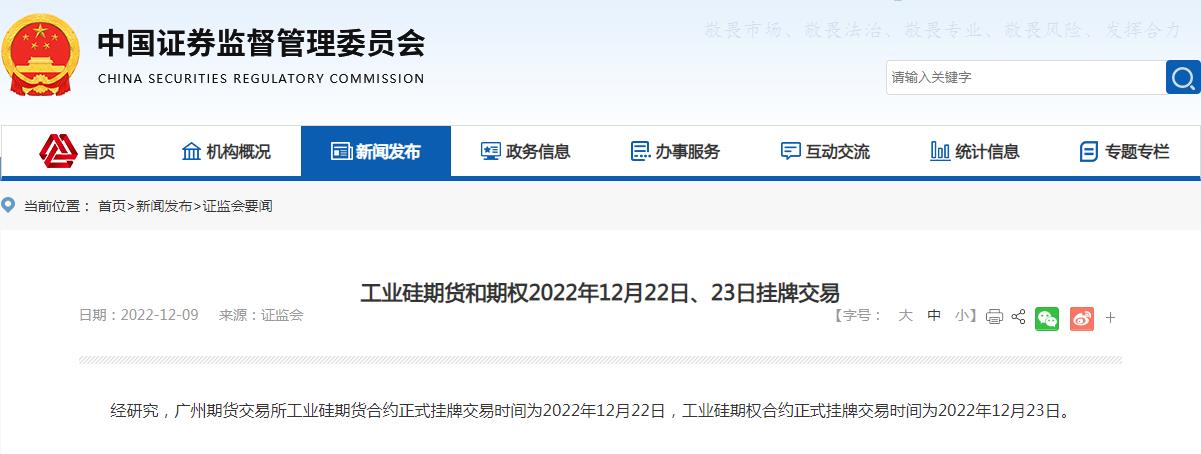 经研究,广州期货交易所工业硅期货合约正式挂牌交易时间为2022年12月22日,工业硅期权合约正式挂牌交易时间为2022年12月23日。