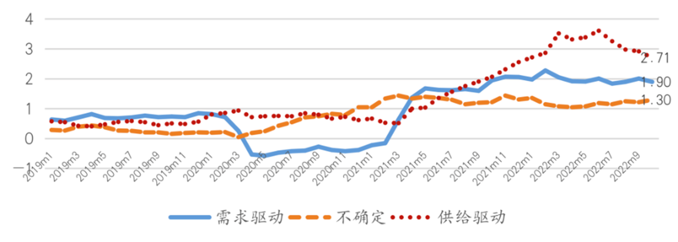 从核心PCE看,今年9月份以来,连续2个月需求驱动在核心PCE中的重要性超过供给驱动的重要性,而从2021年8月到2022年7月,核心PCE中供给驱动的重要性一直超过需求驱动的重要性。