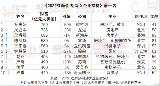 12月12日,胡润研究院发布《2022红颜会·胡润女企业家榜》,列出了今年胡润百富榜上前50名女企业家。