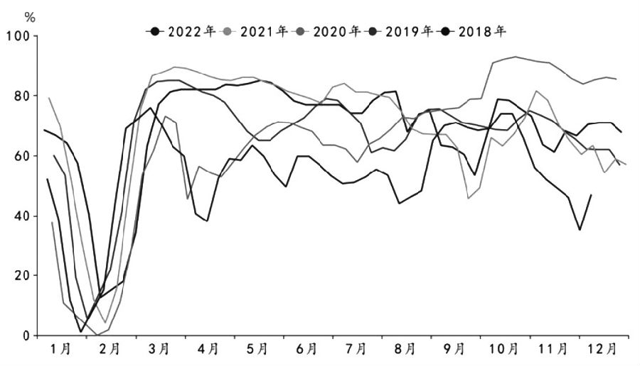 2022年,在居民主动消费意愿以及刚性需求都受到抑制的大背景下,聚酯终端纺织服装消费萎缩,中间纺织印染和涤丝的生产下滑,导致聚酯产量出现负增长。直至12月初,聚酯市场依旧在该利空影响下走弱,终端织造加快降负,江浙织机负荷最低降至35%,大幅低于往年同期60%—70%的开工率水平;加弹负荷降至48%,往年同期维持在80%左右;聚酯行业开工率降至70%附近,较往年同期低20个百分点。消费萎缩成为制约上游原料消费增长的主要因素,导致各环节库存积压且利润低下。