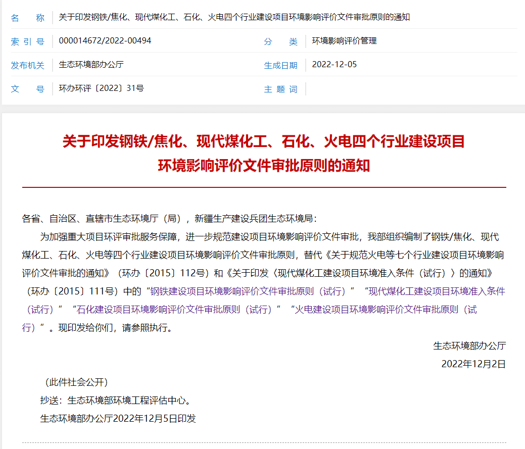 为加强重大项目环评审批服务保障,进一步规范建设项目环境影响评价文件审批,我部组织编制了钢铁/焦化、现代煤化工、石化、火电等四个行业建设项目环境影响评价文件审批原则,替代《关于规范火电等七个行业建设项目环境影响评价文件审批的通知》(环办〔2015〕112号)和《关于印发〈现代煤化工建设项目环境准入条件(试行)〉的通知》(环办〔2015〕111号)中的“钢铁建设项目环境影响评价文件审批原则(试行)”“现代煤化工建设项目环境准入条件(试行)”“石化建设项目环境影响评价文件审批原则(试行)”“火电建设项目环境影响评价文件审批原则(试行)”。现印发给你们,请参照执行。