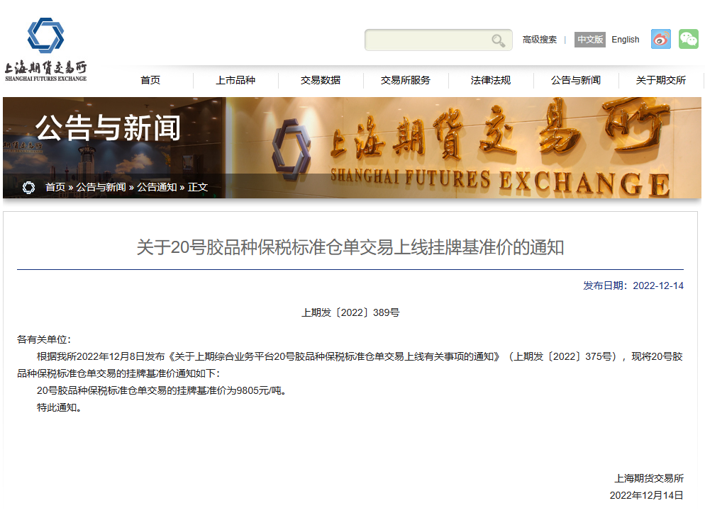 根据我所2022年12月8日发布《关于上期综合业务平台20号胶品种保税标准仓单交易上线有关事项的通知》(上期发〔2022〕375号),现将20号胶品种保税标准仓单交易的挂牌基准价通知如下: