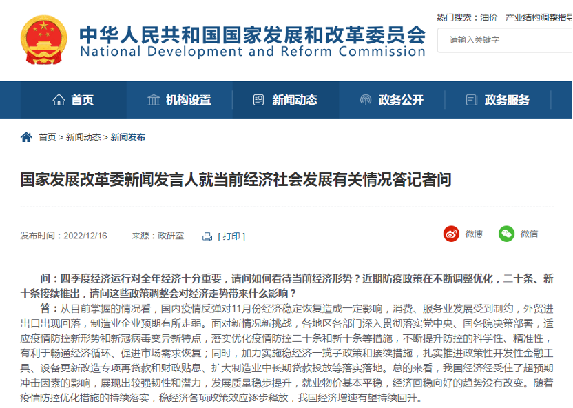 12月16日,国家发改委新闻发言人就当前经济社会发展有关情况答记者问时表示,总的来看,我国经济经受住了超预期冲击因素的影响,展现出较强韧性和潜力,发展质量稳步提升,就业物价基本平稳,经济回稳向好的趋势没有改变。随着疫情防控优化措施的持续落实,稳经济各项政策效应逐步释放,我国经济增速有望持续回升。