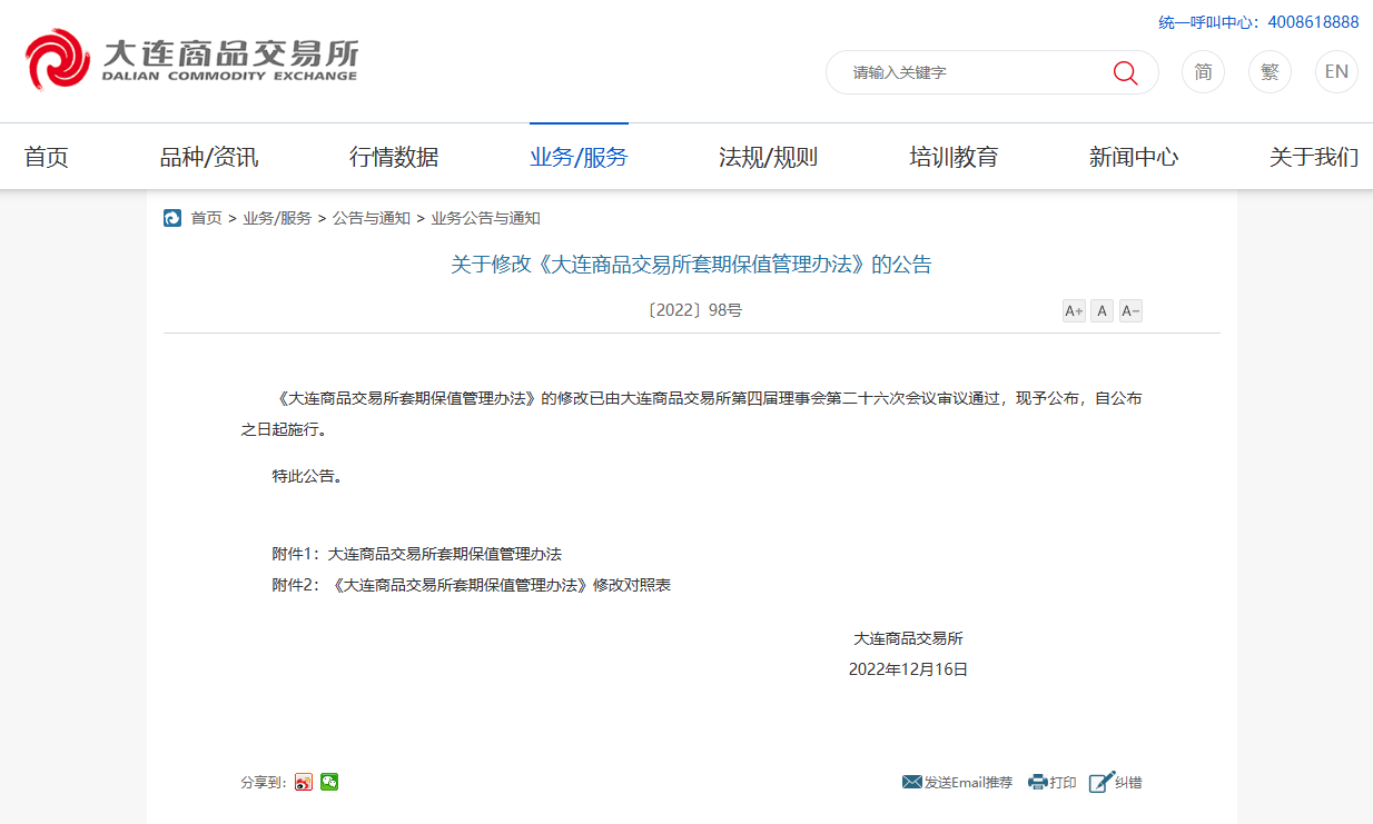 关于修改《大连商品交易所套期保值管理办法》的公告