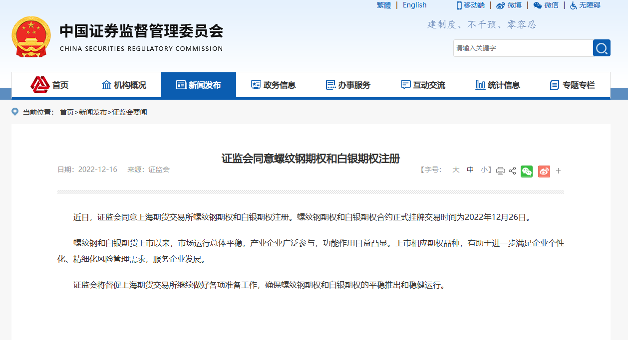 近日,证监会同意上海期货交易所螺纹钢期权和白银期权注册。螺纹钢期权和白银期权合约正式挂牌交易时间为2022年12月26日。