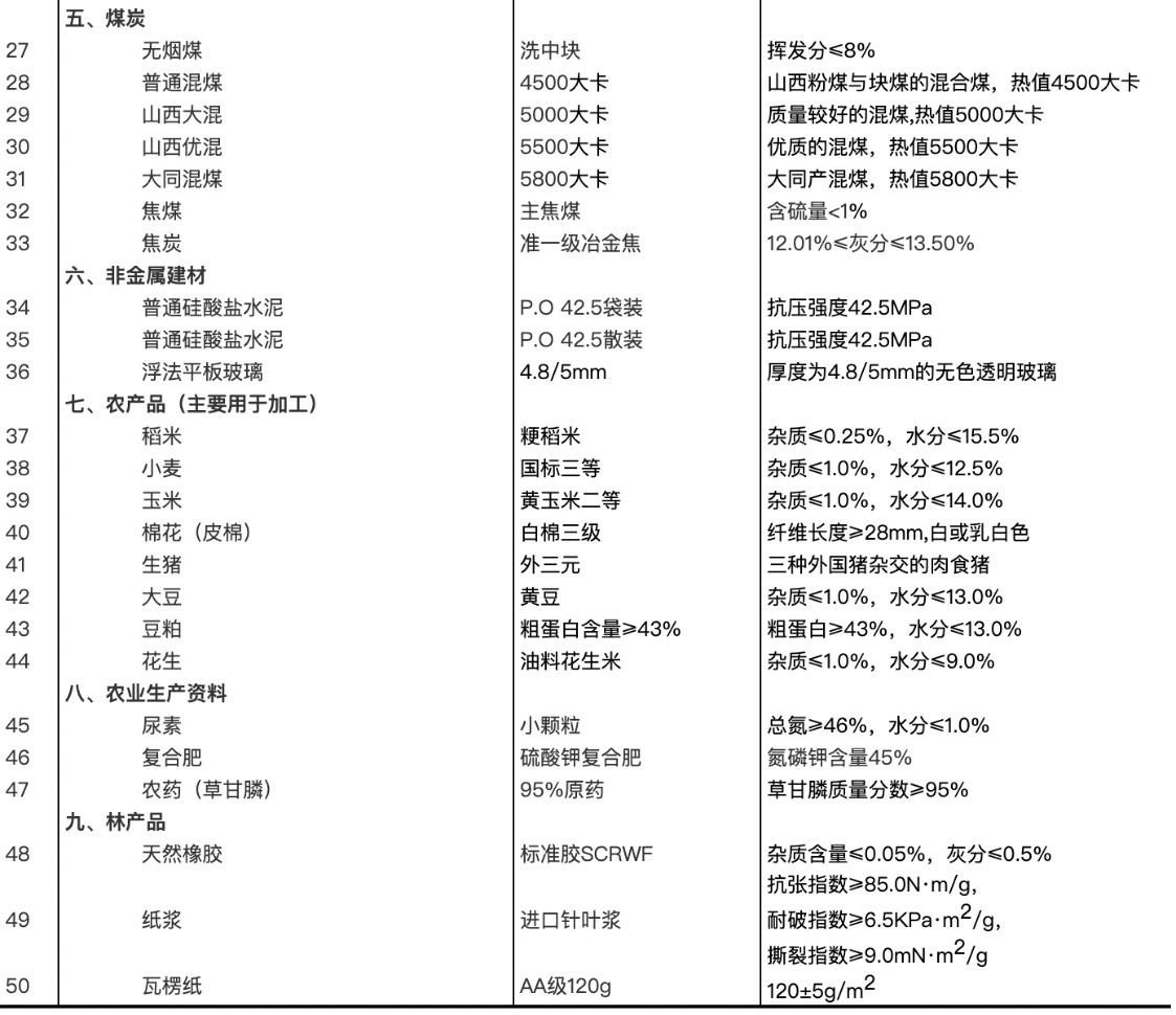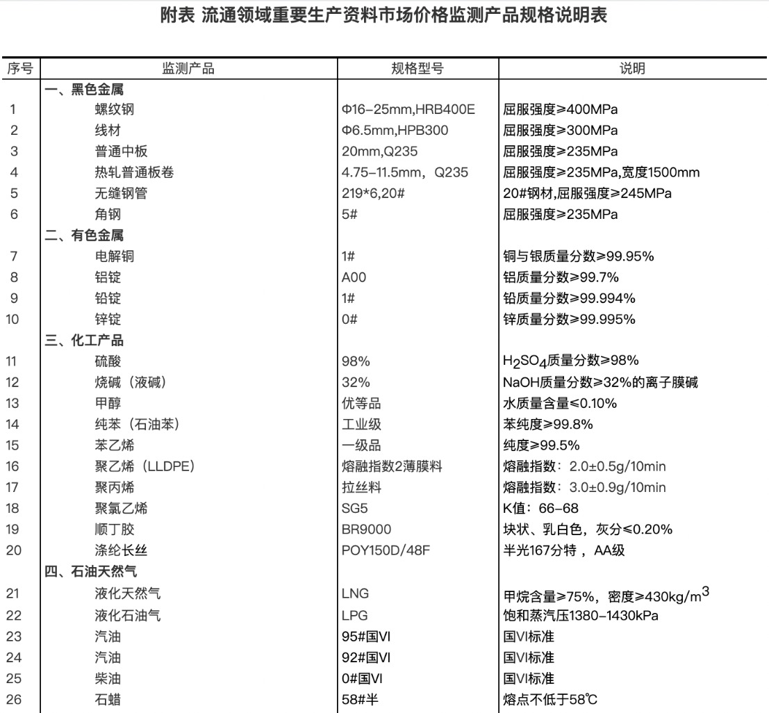 流通领域重要生产资料市场价格监测内容包括9大类50种产品的价格。类别与产品规格说明详见附表。