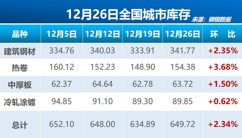 钢银电商26日公布的数据显示,截至12月26日的一周,钢银统计的全国39个城市,共计147个仓库的钢铁总库存量为649.72万吨,环比增加14.83万吨,增幅2.34%。
