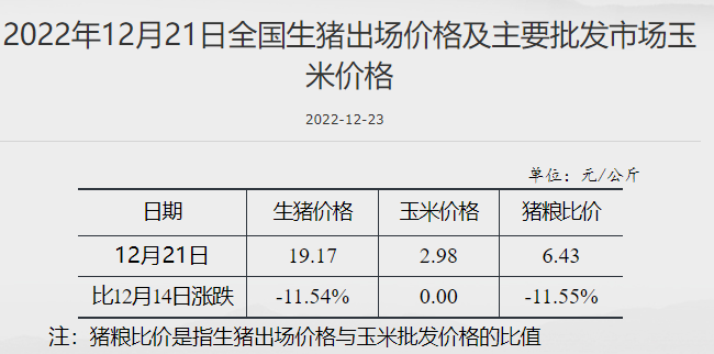 据国家发改委数据,截至12月21日,全国生猪出场价格为19.17元/公斤,较12月14日下跌11.54%;主要批发市场玉米价格为2.98元/公斤,较12月14日持平;猪粮比价为6.43,较12月14日下跌11.55%。