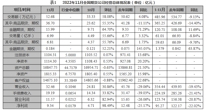 截至2022年11月末,全国共有150家期货公司,分布在30个辖区。2022年10月交易额52.68万亿元,交易量6.99亿手,营业收入32.46亿元,净利润9.34亿元。