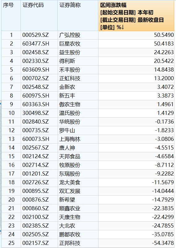 截至12月26日收盘,25只猪肉股的年涨幅平均数为-1.92%,中位数为-3.08%。有10只个股取得正收益,广弘控股(000529.SZ)、巨星农牧(603477.SH)涨幅均达50%,成为最亮眼的猪肉股。挣扎于资金链危机的正邦科技(002157.SZ)表现垫底,股价跌幅达54%。顺鑫农牧(000860.SZ)、大北农(002396.SZ)、天康生物(002100.SZ)与鹏都农牧(002505.SZ)4家小市值猪企的股价跌幅超20%。