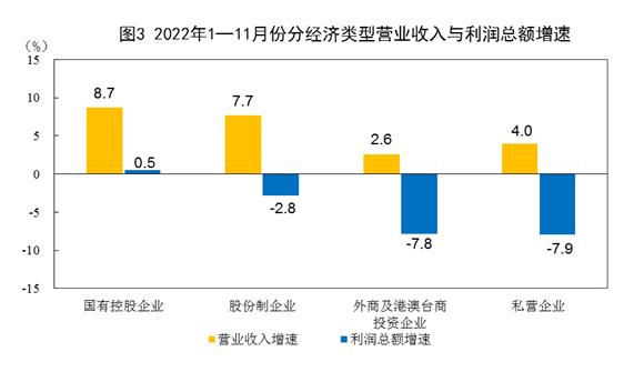 1—11月份,规模以上工业企业中,国有控股企业实现利润总额24049.7亿元,同比增长0.5%;股份制企业实现利润总额56412.0亿元,下降2.8%;外商及港澳台商投资企业实现利润总额18378.5亿元,下降7.8%;私营企业实现利润总额22636.9亿元,下降7.9%。