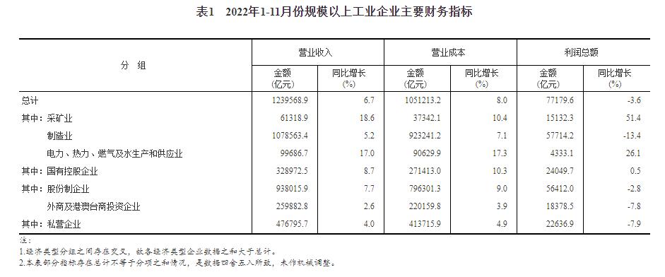 1—11月份,全国规模以上工业企业实现利润总额77179.6亿元,同比下降3.6%(按可比口径计算,详见附注二)。