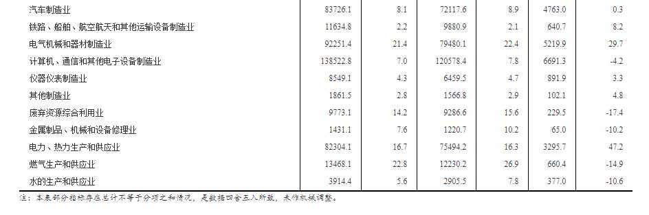 二、规模以上工业企业利润总额、营业收入等指标的增速均按可比口径计算。报告期数据与上年所公布的同指标数据之间有不可比因素,不能直接相比计算增速。其主要原因是:(一)根据统计制度,每年定期对规模以上工业企业调查范围进行调整。每年有部分企业达到规模标准纳入调查范围,也有部分企业因规模变小而退出调查范围,还有新建投产企业、破产、注(吊)销企业等变化。(二)加强统计执法,对统计执法检查中发现的不符合规模以上工业统计要求的企业进行了清理,对相关基数依规进行了修正。(三)加强数据质量管理,剔除跨地区、跨行业重复统计数据。