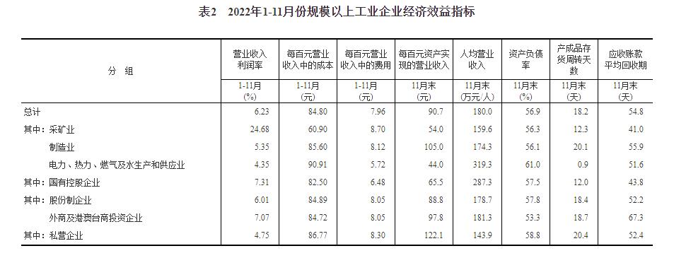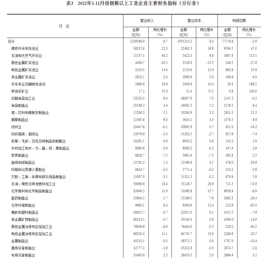 11月份,受疫情反弹和需求不足等因素影响,工业生产有所放缓,企业经营压力加大,但利润结构持续改善。1—11月份工业企业效益状况呈现以下主要特点: