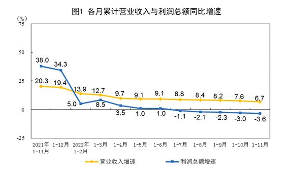 一是工业企业营收保持增长,利润有所下降。1—11月份,全国规模以上工业企业营业收入同比增长6.7%,企业销售总体保持稳定增长。受疫情反弹和需求不足等因素影响,工业企业利润同比下降3.6%,降幅较1—10月份扩大0.6个百分点。个别行业及少数重点企业对工业企业利润下拉影响较大。其中,钢铁、石油加工行业利润同比降幅较大,两家疫苗重点企业由于利润同期基数较高,利润同比大幅减少。剔除上述行业及企业,其他规上工业企业利润同比增长6.6%。