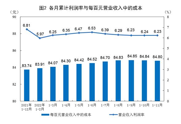 1—11月份,规模以上工业企业每百元营业收入中的成本为84.80元,同比增加1.02元;每百元营业收入中的费用为7.96元,同比减少0.46元。