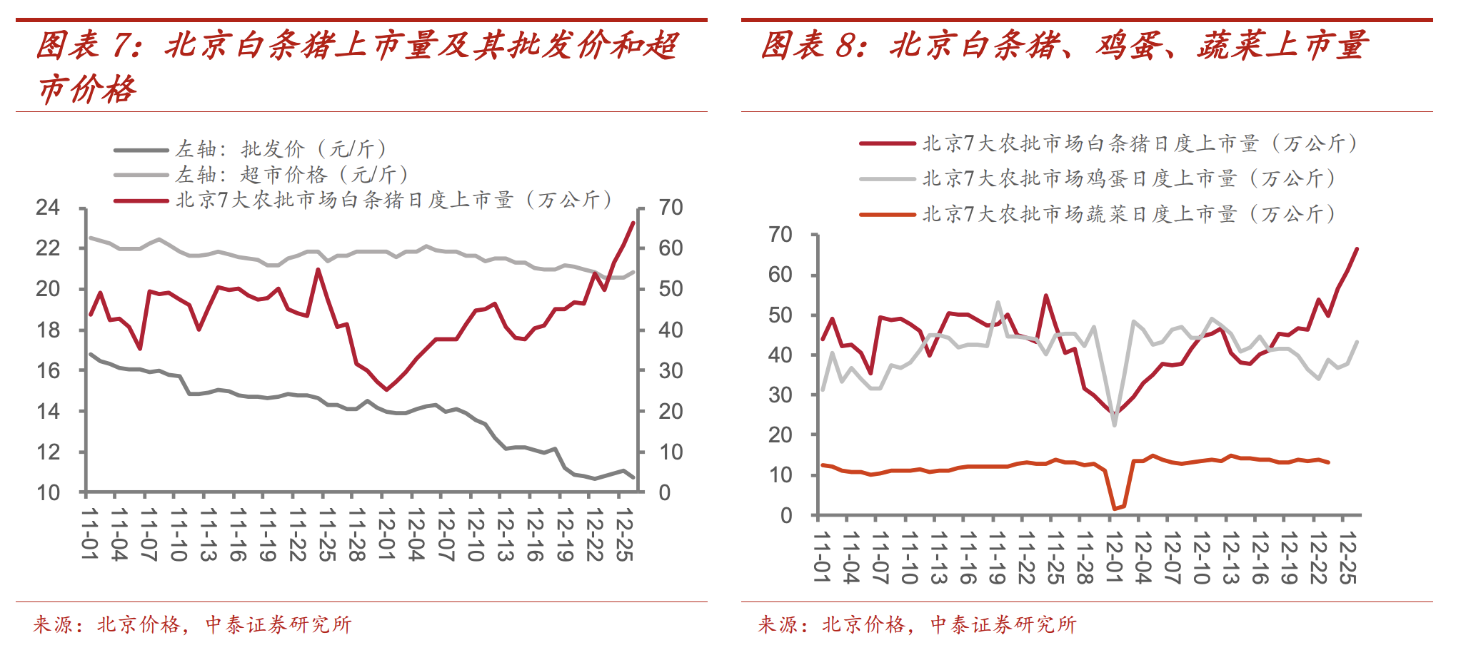 来自中泰证券的研究显示,在度过防疫措施优化后的冲击后,北京市场猪肉市场出现量价齐升的复苏景气。截至12月26日北京7大批发市场白条猪上市量较12月初低点已经增长了164%,较前高增长了21%。