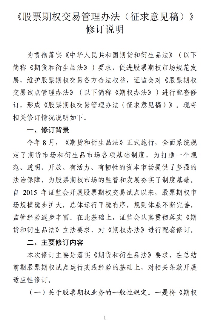 为贯彻落实《中华人民共和国期货和衍生品法》(以下简称《期货和衍生品法》)要求,证监会对《股票期权交易试点管理办法》作了配套修订,形成《股票期权交易管理办法(征求意见稿)》,现向社会公开征求意见。