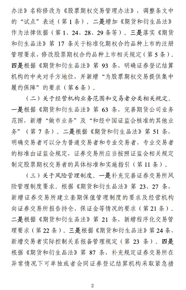 《期货和衍生品法》全面系统规定了期货市场和衍生品市场的各项基础制度,为股票期权市场发展提供了坚强的法治保障。证监会严格贯彻落实《期货和衍生品法》的立法要求,在保持股票期权现行制度框架总体稳定的基础上,结合股票期权扩大试点以来的监管实践经验,进行适应性修订。