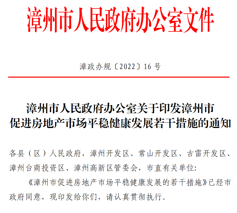 12月29日,漳州市发布《漳州市促进房地产市场平稳健康发展若干措施》的通知。