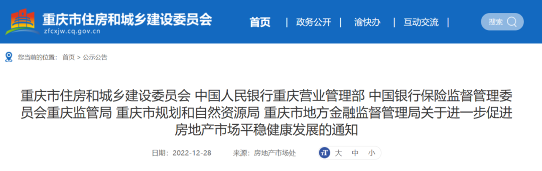 12月28日,重庆市住房和城乡建设委员会、中国人民银行重庆营业管理部、中国银行保险监督管理委员会重庆监管局、重庆市规划和自然资源局、重庆市地方金融监督管理局联合出台《关于进一步促进房地产市场平稳健康发展的通知》。