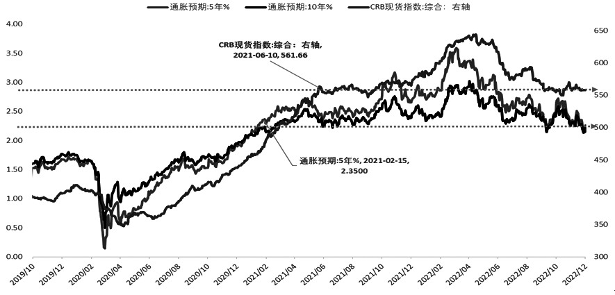 图为美国国债隐含通胀预期与CRB现货综指走势