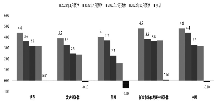 2022年全球经济呈现出典型的低增长、高通胀的滞胀特征,并在疫情、通胀、加息和冲突的四重奏中,徘徊在滞胀和衰退之间。后疫情时代,各国的防疫措施不断松绑,各项刺激政策也陆续退潮;俄乌冲突的爆发加剧了全球通胀,更是给欧洲经济带来了能源、财政和经济等一系列难题,新兴经济体则面临着融资环境收紧、美元回流、粮价飞涨等多重打击,不少国家出现人道主义危机。IMF等国际权威机构不断下调2022年全球经济和世界贸易增速,通胀拐点虽现,但仍居于高位,依旧是主导发达经济体宏观决策的主要宏观因子。