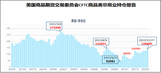 而在期货市场上,美国商品期货交易委员会CFTC的持仓报告显示,截至12月27日当周,投机类黄金净多头持仓增加至的136880手,若该持仓数据能够突破8月份142851手的高点,则有望构成持续增持的趋势。