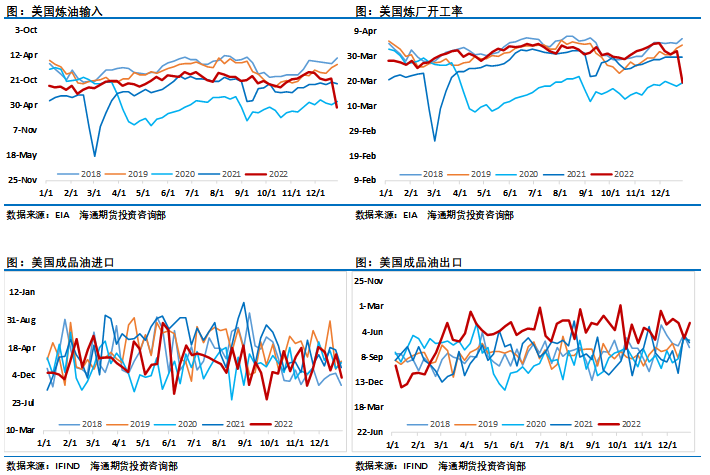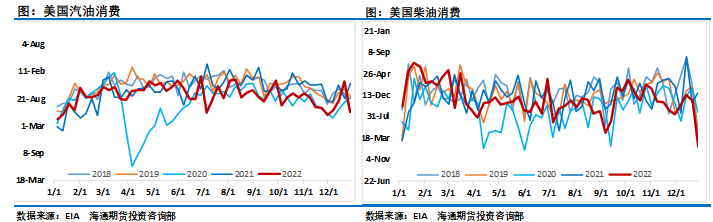 从供需层面来看,最近投资者关注的焦点集中在2023年原油市场需求的变化上,市场对此形成了明显的分歧,乐观与悲观观点形成碰撞,油价也在其中不断摇摆。2022年12月油价的反弹正是因为对需求担忧缓解,但新年又迅速跌入悲观,对全球经济衰退的担忧再次困扰市场。EIA数据显示,截至2022年12月30日当周,受圣诞假期及风暴寒潮影响,美国炼油及消费均出现大幅下滑,美国EIA精炼厂设备利用率出现自2021年2月以来最大降幅,美国原油产品四周平均供应量为2047.3万桶/日,同比减少4.25%,汽油需求创2020年3月以来最大降幅,柴油需求降幅更大,这导致美国当周石油需求至少创下1990年以来最大降幅。不过,这只是短暂的冲击,下周数据将会出现明显的快速回升。尽管如此,我们还是看到了油价的大幅走弱。