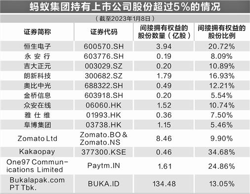 除了上述A股公司,蚂蚁集团持股5%以上的上市公司还包括港股众安在线、雅仕维、阜博集团,另外蚂蚁集团还持股韩国支付公司Kakaopay、印度外卖公司Zomato、印度支付公司One97 Communications Limited、印度尼西亚电子商务港公司 Bukalapak。