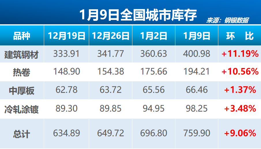 钢银电商9日公布的数据显示,截至1月9日的一周,钢银统计的全国39个城市,共计147个仓库的钢铁总库存量为759.90万吨,环比增加63.10万吨,增幅9.06%。