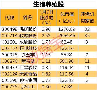 1月9日,生猪养殖企业普遍微涨,温氏股份、牧原股份、东瑞股份涨幅居前,分别上涨2.96%、2.53%、1.73%。根据近期主要上市公司披露的2022年12月销售数据,猪产品销售均价、销售收入普遍环比下降,而同比2021年12月仍保持大幅增长,意味着生猪养殖企业四季报均有望实现盈利回升。