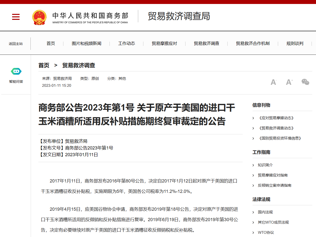 1月11日,商务部网站消息,根据《反倾销条例》第五十条的规定,商务部根据调查结果向国务院关税税则委员会提出继续实施反倾销措施的建议,国务院关税税则委员会根据商务部的建议作出决定,自2023年1月12日起,对原产于美国的进口干玉米酒糟继续征收反倾销税,实施期限为5年。