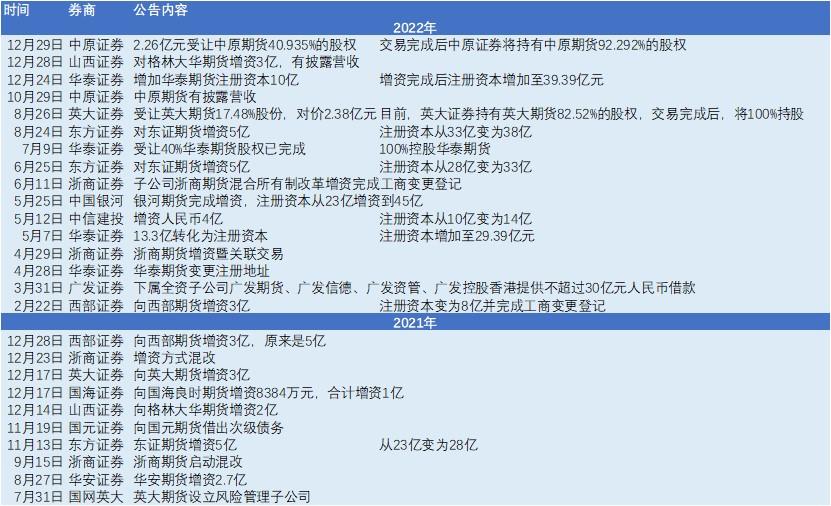 2022年12月29日,中原证券公告,公司将以2.26亿元受让河南省铁路建设投资集团有限公司公开挂牌转让其持有的中原期货40.935%的股权。该次交易完成后,中原证券将持有中原期货92.292%的股权;12月28日,山西证券公告,向其全资子公司格林大华期货有限公司增资3亿元人民币;12月24日,华泰证券公告,为华泰期货增加注册资本10亿,增资完成后华泰期货注册资本为39.39亿元。