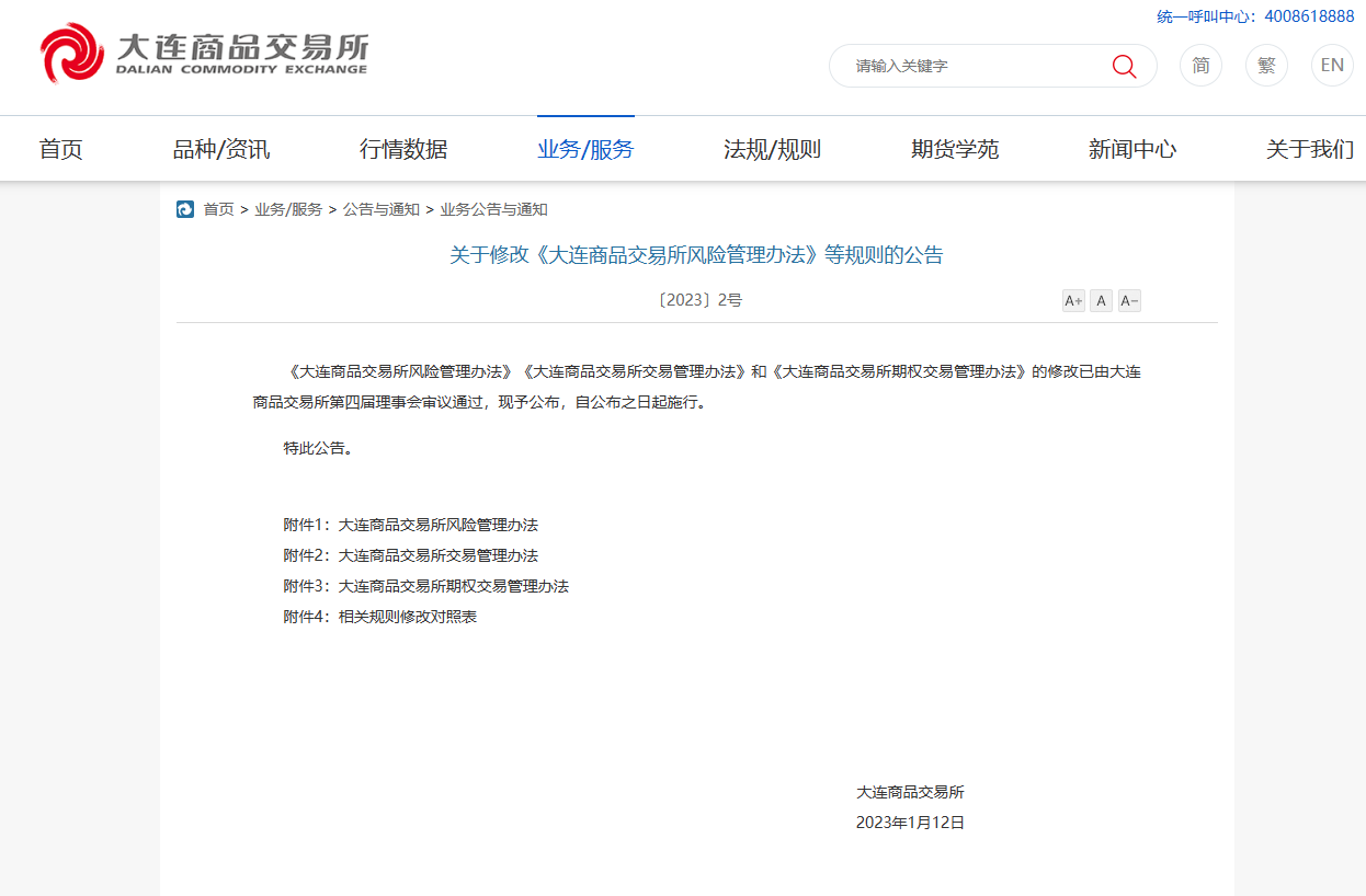 《大连商品交易所风险管理办法》《大连商品交易所交易管理办法》和《大连商品交易所期权交易管理办法》的修改已由大连商品交易所第四届理事会审议通过,现予公布,自公布之日起施行。