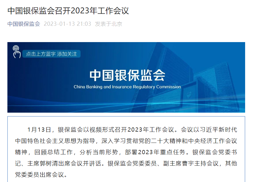 银保监会1月13日召开2023年工作会议,回顾总结工作,分析当前形势,部署今年重点任务。